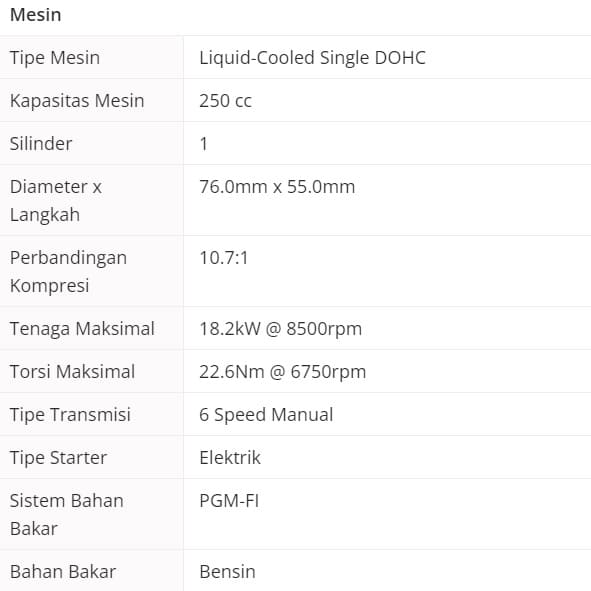 Tenaga maksimum yang dapat dihasilkan mampu capai 18,9 kW @8.500 rpm, dengan maksimum torsi sebesar 23,1 Nm @6.500 rpm. Selain punya tenaga dan torsi yang ajib, penyaluran daya juga lebih maksimal karena sudah aplikasi Assist/ Slipper Clutch.