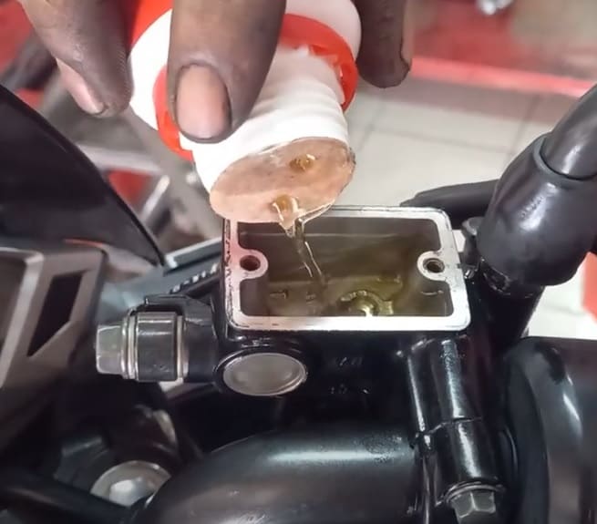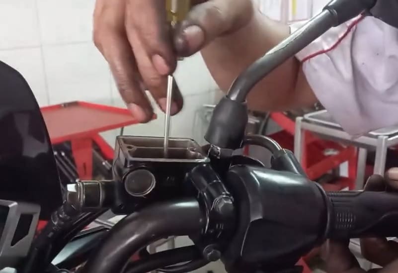 Bilas dengan mengisikan air bersih ke dalam tabung master rem. Kemudian, dibantu dengan semprotan tekanan udara, terutama ke saluran minyak rem menuju piston dan slang rem. Yakiiin, bakal tersemprot keluar air bercampur kotoran yang masih ngendon di dalam tabung minyak rem. Lakukan sampai tuntas semua mengalir keluar lewat nipel pembuangan di kaliper. Ingat ya, air bersih saja