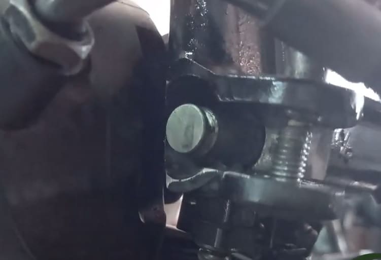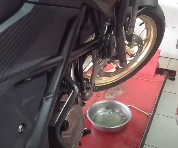 Ow emji, butek bin keruh, wkwkwkwk. Pantes nggak bisa diintip dari lubang kaca pemantau, lha butek cairan dalamnya. Kemudian dilanjut dengan membuka nipel pembuangan di kaliper bawah/kepala babi. Ngocorlah minyak rem lawas yang sudah rada butek pekat, tanda minta dikuras dan diganti baru. Mekanik sudah menyiapkan wadah penampung sekaligus menyiapkan air campur sabun. Gunanya? Ya untuk membilas dan membersihkan master rem dan semua salurannya