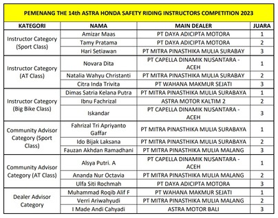 PT Astra Honda Motor (AHM) kembali menguji sekaligus mengalibrasi kompetensi instruktur safety riding Honda melalui The 14th Astra Honda Safety Riding Instructors Competition (AHSRIC) 2023. Kegiatan ini menjadi bagian dari upaya perusahaan menyiapkan instruktur safety riding yang terlatih untuk mendukung terciptanya budaya aman dan nyaman dalam berkendara di tengah masyarakat.