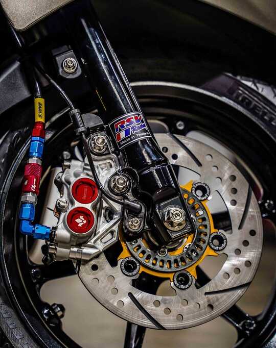 Berlanjut dengan piranti penjepit cakram depan. Kaliper dobel piston juga diganti, yang gunakan produk lokal Thailand yang asoii, berlabel 81 Racing