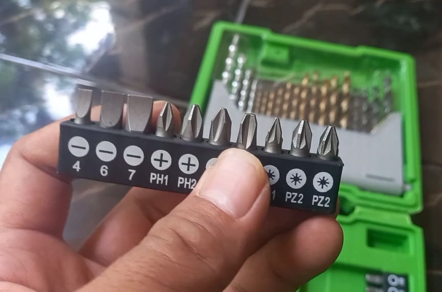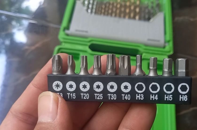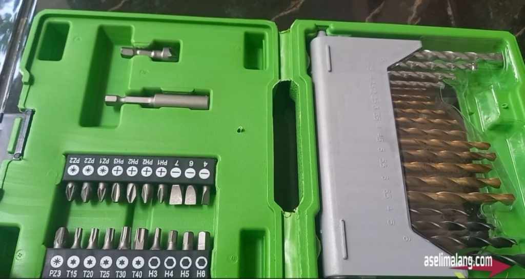 Nah, nggak cuma dapat mata bor saja kan? Dapat obeng juga, kunci bintang dan kunci L juga tuh, yang bisa dipakai untuk beragam keperluan.