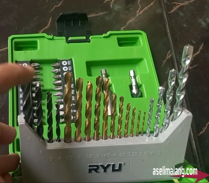 Punya alat bor RYU dirumah, dengan mata bor bawaan yang hanya 2 ukuran, memang jadi terbatas penggunaannya. Apalagi bila hendak dipakai untuk mengebor media yang berbeda, wah, ribet kudu cari pinjaman mata bor. Akhirnya, pesan deh set aksesoris mata bor, juga keluaran RYU