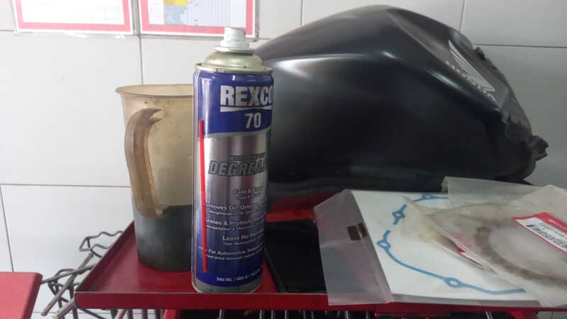 - Penggunaan cairan degreaser. Pembersihan perangkat-perangkat mesin seperti area CVT, serta box filter udara dengan cairan khusus degreaser. Selain lebih bersih dan maksimal, cairan ini juga tidak meninggalkan bekas laiknya penggunaan bensin. Setelah dibersihkan dengan degreaser, cukup disemprot air dilanjutkan dikeringkan dengan tiupan angin kompresor. Beres, semua komponen bersih dan kering tanpa berminyak dan bau