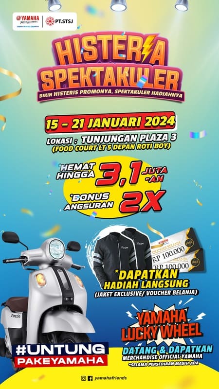 PT. Surya Timur Sakti Jatim (Yamaha STSJ) distributor sepeda motor Yamaha area Jawa Timur, NTB & NTT kembali memberikan kabar baik bagi masyarakat. Pasalnya Yamaha STSJ menghadirkan gelaran pameran Histeria Spektakuler dengan memberikan berbagai penawaran menarik dan hadiah spektakuler. Berbagai produk Unggulan dan teknologi terkini dari Yamaha di pamerkan sehingga konsumen dapat melihat dan merasakan langsung keunggulan motor Yamaha. Pameran ini diselenggarakan mulai periode 15 Januari 2024 hingga 21 Januari 2024 di Tunjungan Plaza 3, Surabaya, Jawa Timur.
