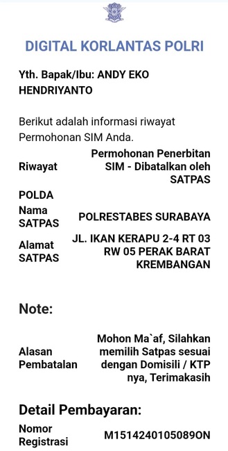 Yups, permohonan saia dibatalkan oleh Polda Jawa Timur, dengan alasan harus ke Satpas sesuai domisili saia, yaitu Satpas Singosari. Haduh…