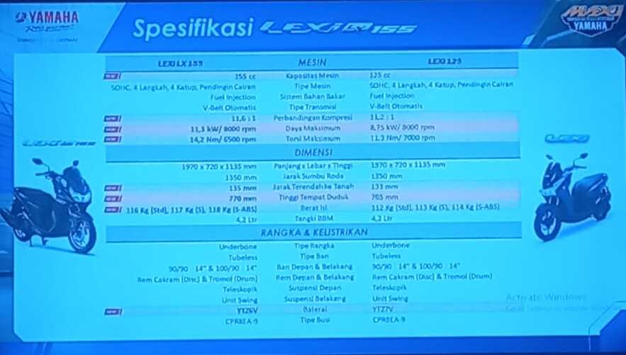 Sstt, ada info nih, kalau ternyata, torsi LEXi 155 ini, justru diatas torsi Aerox 155. Nah, baru tahu kan? Yups, dari spesifikasi teknis torsi 14,2 Nm / 6.500 rpm ini sedikit diatas Aerox yang di angka 13.9Nm / 6500rpm. Didukung pula dengan bobot LEXi 155 yang hanya 118 kg (tipe ABS) semenatar Aerox beratnya capai 126 kg (tipe ABS). Kalau tenaga sih serupa, yaitu di angka 11,3 kW / 8.000 rpm