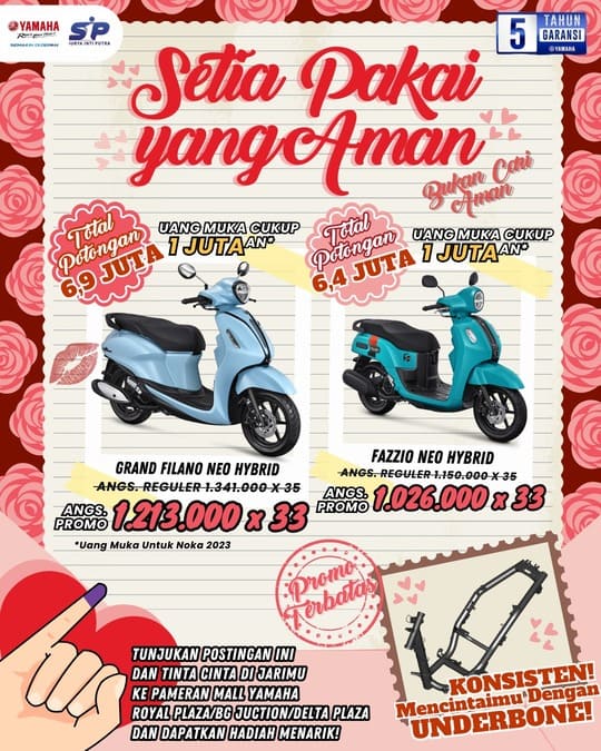 “Bertepatan dengan hari kasih sayang, kami ingin memberikan program spesial bagi konsumen Yamaha. Program ini sekaligus menjadi bentuk apresiasi dari Yamaha kepada konsumen setia yang telah memilih Yamaha sebagai kendaraan pilihan. Semoga perjalanan konsumen semakin menyenangkan bersama dengan skutik Classy Yamaha,” ungkap William Saputra, Manager Promosi Yamaha STSJ.