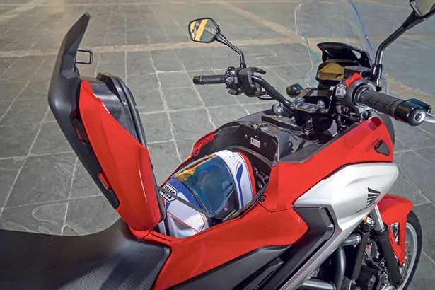 Honda NC750X, sudah identik dengan idiom motorsport dengan bagasi gede. Lha gimana nggak, wong ternyata, bentukan tangki didepan pengendara ini ternyata bukan penampung bahan bakar, namun merupakan bagasi.