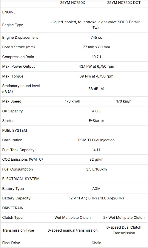 Pembangkit daya Honda NC750X, adalah mesin 2 silinder segaris berkapasitas 745cc dengan 8 katup dan sistem injeksi bahan bakar. Berpendingin cairan, dengan pilihan transmisi manual 6 percepatan dan matik DCT 6 percepatan, menyalurkan tenaga 56,6 PS/6750 RPM dengan torsi 69 Nm/4750 RPM. Jangan lupa ya, penggantian oli mesin nyaris serupa mobil, 4 liter 😆