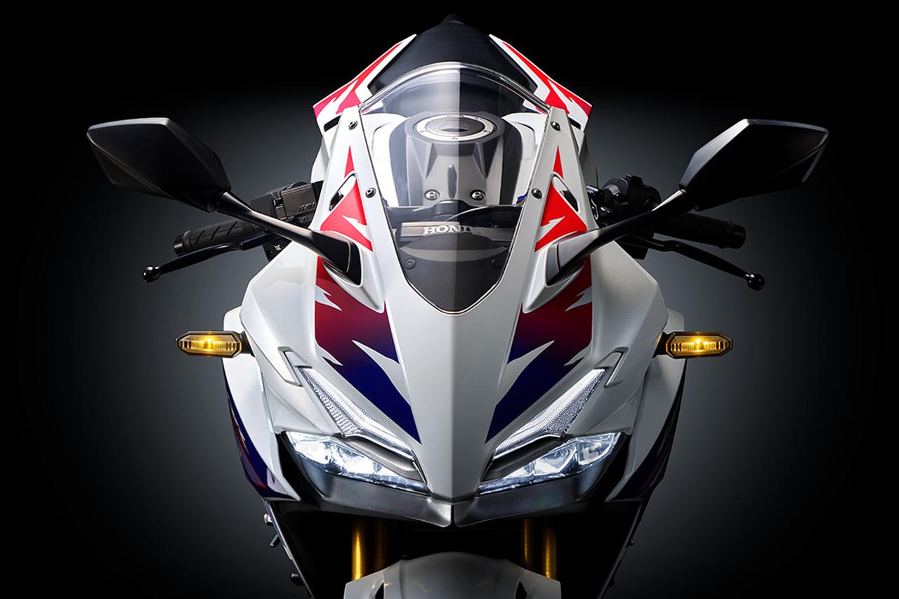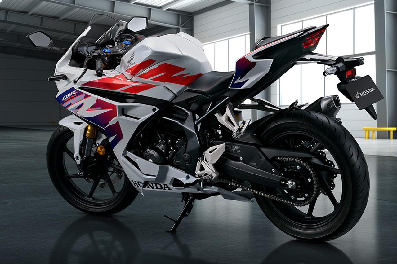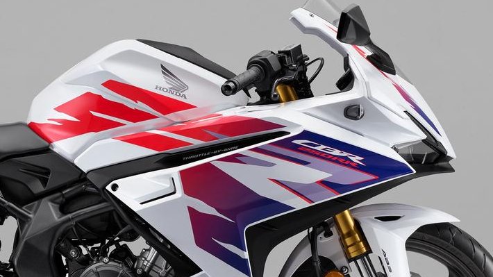 Siluet huruf R pada fairing depan CBR ini tersamar dengan gradasi, namun bisa dinikmati penuh, menegaskan DNA racingnya. Fitur lain seperti mesin 250cc 2 silinder bertenaga, throttle by wire, rem ABS, quickshifter, assist & slipper clutch, serta 3 mode riding yang bisa dipilih melalui tombol di panel setang kiri. Yang membedakan paling hanya penempatan lampu sein depan serta penambahan mata kucing/reflektor pada sepatbor depan
