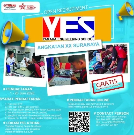 Yamaha Engineering School (YES) kembali dibuka tahun 2025 ini. Pelatihan mekanik sepeda motor besutan pabrikan Yamaha ini, resmi dibuka sejak 1 Juni hingga 20 Juni 2025 mendatang