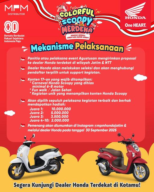 Ada kabar seru nih, senyampang kegiatan tahunan Agustusan. Yaitu, kegiatan Colorful Scoopy Merdeka yang digelar PT Mitra Pinasthika Mulia (MPM Honda Jatim), distributor sepeda motor Honda wilayah Jatim & NTT. Mengusung tema “Merdeka Penuh Gaya Bareng Scoopy”, kegiatan ini berlangsung serentak di 251 lokasi mulai 1 Agustus hingga 10 September 2025.