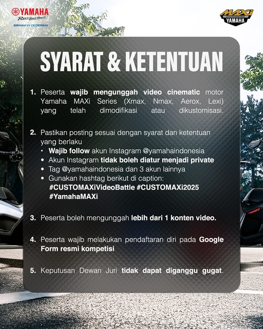 Kompetisi berlabel CustoMAXI video battle 2025 ini, digelar Yamaha untuk mengakomodir penggila modifikasi MAXI Yamaha