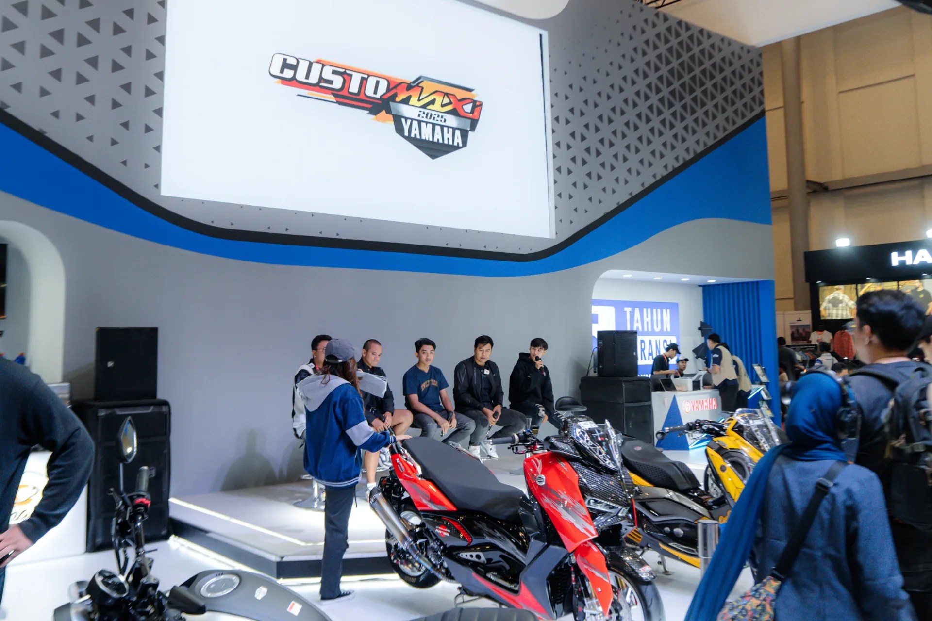 Kemeriahan di-booth semakin lengkap dengan hadirnya modifikasi MAXi seperti NMAX “TURBO”, AEROX ALPHA, dan XMAX dalam CustoMAXi Yamaha (28/9). Terasa spesial, Yamaha juga menggelar acara nobar FIM R3 BLU CRU World Cup Series Aragon, Spanyol dengan turut menampilkan pebalap binaan Yamaha Racing Indonesia, Arai Agaska yang berhasil finish di-urutan 10 pada balapan hari itu.