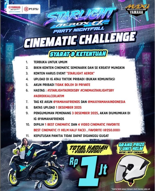 Komunitas Yamaha Aerox kembali mendapat ruang unjuk kreativitas lewat gelaran Starlight Aerox V.2 Party Nightfall yang akan diselenggarakan oleh Yamaha STSJ pada Sabtu mendatang, 29 November 2025 di Yamahaland. Acara ini terbuka untuk seluruh pengguna Yamaha Aerox yang ingin menikmati malam penuh aktivitas mulai dari modifikasi, konten kreatif, hingga nyoride rame-rame.