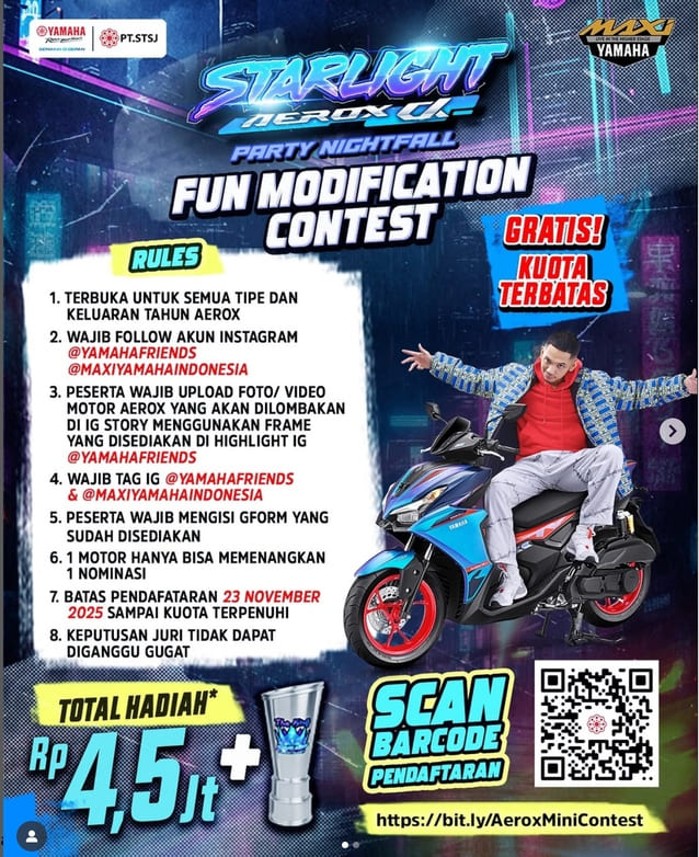 Komunitas Yamaha Aerox kembali mendapat ruang unjuk kreativitas lewat gelaran Starlight Aerox V.2 Party Nightfall yang akan diselenggarakan oleh Yamaha STSJ pada Sabtu mendatang, 29 November 2025 di Yamahaland. Acara ini terbuka untuk seluruh pengguna Yamaha Aerox yang ingin menikmati malam penuh aktivitas mulai dari modifikasi, konten kreatif, hingga nyoride rame-rame.