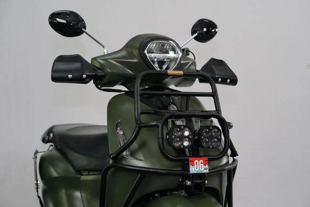 Skutik Classy Yamaha yang ini punya gaya seperti motor adventure yang jadi konsep unik untuk memodifikasi Grand Filano Hybrid. Seperti Grand Filano Hybrid berwarna hijau matte modifikasi asal Bali yang mengusung konsep adventure dengan menambahkan beberapa aksesoris yang identik dengan motor petualang, yaitu seperti crashbar berwarna hitam kokoh di bagian fasia depan motor dan tak lupa juga untuk memasang handguardnya sehingga penampilannya menjadi tangguh dan siap diajak untuk eksplorasi.
