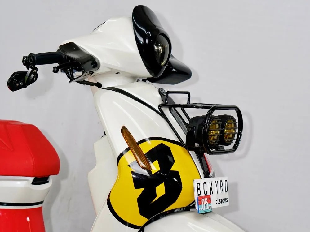 Si Kumo ini dimodifikasi asal Japanese Urban Transporter tahun 80’an dengan beberapa sentuhan modifikasi tipis yang memadukan warna dasar putih dengan warna merah di bagian rak depan dan biru untuk jok tebal dengan patch JDM khas skutik Jepang serta beberapa grafis yang menyebutkan identitas skutik ini, yaitu Kumo dan stiker decal tulisan Jepang untuk mempertegas identitasnya.