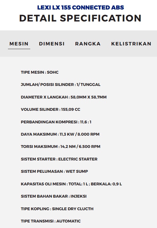 Spesifikasi Yamaha LEXi LX 155 bisa disimak berikut