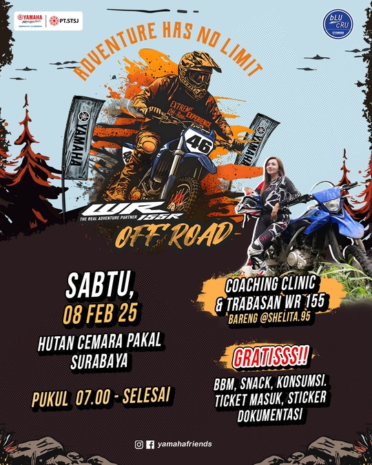 Dan asyiknya, nggak hanya trabas alias offroad pakai WR155R kesayanganmu. Bakal ada coaching clinic bareng salah satu trabaser cewek andalan , yaitu si Shelita. Si cantik ini bakal ngobrol asyik seputar motor trail ,trabas dan segala macemnya.. berbagi ilmu serta pengalaman dengan peserta lain