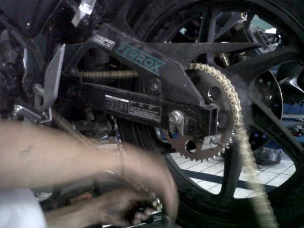 Sebenarnya, melumasi rantai bisa dikerjakan sepaket dengan menyetel rantai. Kalau saia pribadi, biasanya lakukan pengecekan rantai 2 minggu atau sebulan sekali saat senggang. Cukup mudah, berbekal kunci ring ukuran 22, 17, 10 dan 12 untuk motor laki macam CB150R ini. Kunci 22 dan 17 untuk mengendurkan mur as roda, dan 10 serta 12 untuk merubah anting setelan as roda. Patokan setelan kekencangan rantai mudah, karena sudah terpasang di stiker pada tutup rantai bawaan pabrikan Honda