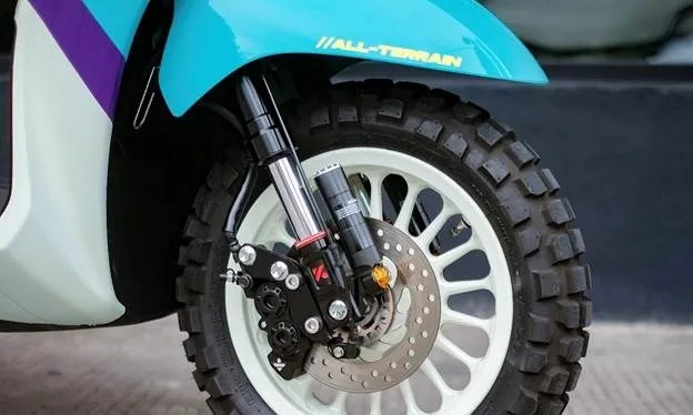 Part modifikasi yang unik dan mencuri perhatian adalah pada bagian rodanya yang sudah menggunakan tipe ban Dual Purpose sehingga mampu mendukung segala rute perjalanan apalagi didukung juga dengan mesin berteknologi Blue Core Hybrid 125cc yang irit dan bertenaga sehingga semakin mendukung konsep modifikasinya yang terinspirasi dari mobil rally yang tangguh. Tipe ban ini juga dipilih karena tetap mempertimbangkan kenyamanan saat diajak riding santai di perkotaan seperti Community Ride, Sunmori, hingga nongkrong asik.
