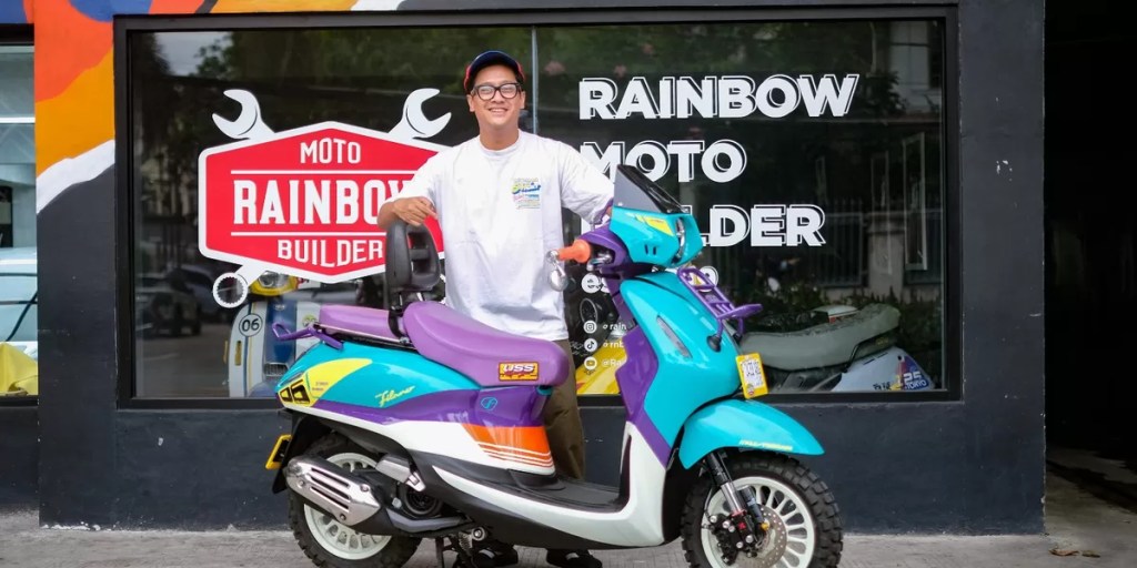 Founder dari komunitas bernama Kalcer Skuter ini sukses menerjemahkan nuansa retro rally ke dalam skutik kalcer anak muda zaman now, yaitu Grand Filano Hybrid yang punya desain retro tapi tetap punya berbagai fitur modern nan canggih sehingga relevan untuk bermobilitas sehari-hari di perkotaan. Bentuk bodi dan desainnya yang ikonik menjadi alasan utama Adega untuk memodifikasi skutik ini sehingga permainan warna hijau tosca, ungu, dan oranye serta tambahan grafis kuning sebagai latar belakang dari identitas khas rally pada bagian bodi menjadi daya tarik utamanya.