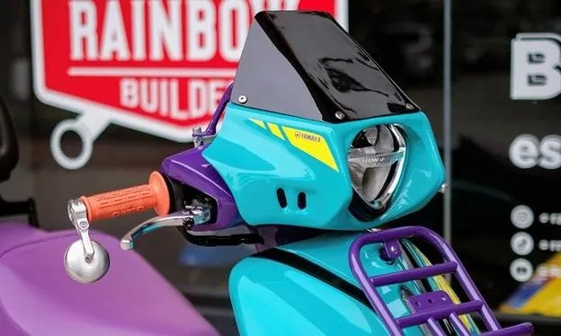 Bagian depan skutik ini tampil berbeda berkat penggunaan custom retro headcover bergaya rally 80-an dengan bentuk lebih tegas dan dilengkapi mini visor smoke. Perpaduan warna tosca dan ungu pada area batok lampu memperkuat karakter Urban Rally yang kental, sekaligus tetap menyatu dengan desain retro modern yang dimunculkan pemasangan front rack berwarna ungu yang terpasang dengan rapi