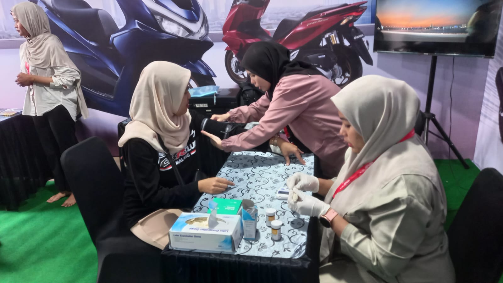 Pemudik, sembari menunggu motornya dicek dan diservice bila ada keluhan, bisa melipir masuk ke bangunan utama BSH. Brrr.. sejuk bener nih dengan pendingin udara. Fasilitasnya selain nyaman dengan pendingin udara, juga lengkap banget. Ada pemeriksaan kesehatan gratis dengan tenaga medis profesional. Bisa cek tekanan darah/tensi sekaligus juga cek kadar hula darah nih. Jadi tenang bisa pantau kondisi badan