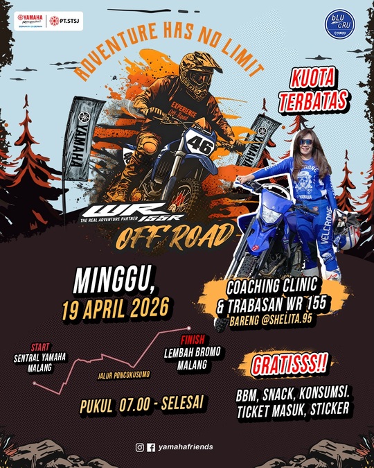 Bakal digelar pada Minggu 19 April 2026 mendatang dengan titik start di Yamaha Sentral Malang. Syarat ikutan nggak neko-neko nih, utamanya jelas, pengguna dan menggunakan Yamaha WR155R.