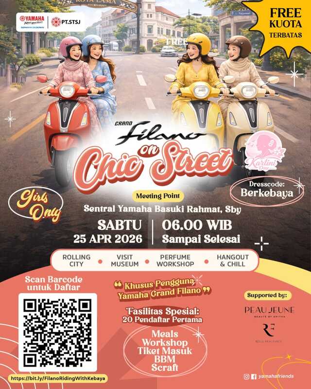 Dannn, spesial pengguna Yamaha Grand Filano, Yamaha STSJ sebagai main dealer area Jatim, Kalselteng dan Nusa Tenggara bakal helat acara spesial memperingati hari Kartini. Tajuknya adalah “Grand Filano Chic on Street”