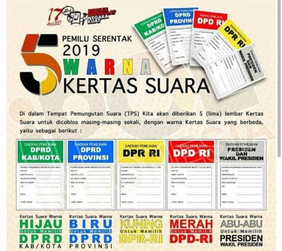 Tapi tenang, meski banyak (5 lembar), nggak perlu bingung karena masing-masing sudah diberikan kode warna untuk membedakan. Ada warna abu-abu untuk surat suara/SS Pilpres, warna merah untuk DPD , warna kuning untuk DPR RI, warna biru untuk DPRD Provinsi (Tk I) dan terakhir warna hijau untuk DPRD Kabupaten/Kota (Tk II)