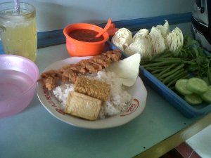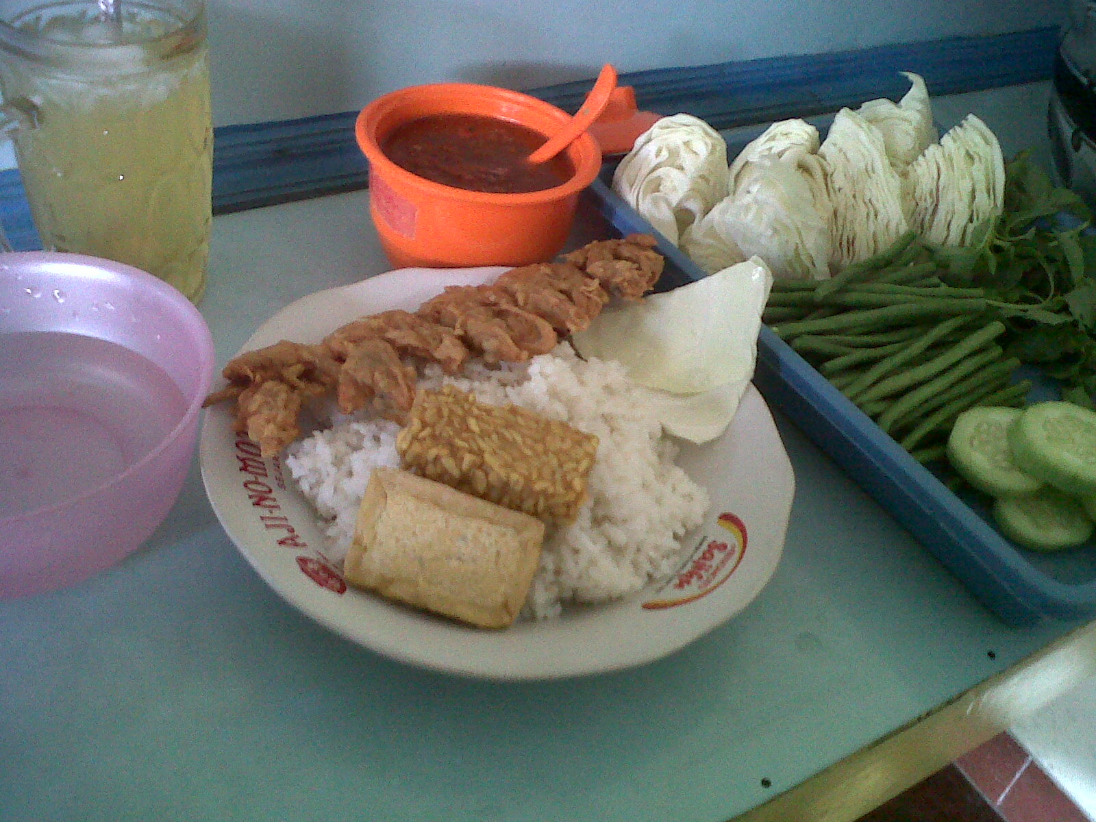 Karena siang-siang, pinginnya lalapan plus es jeruk. Ya wis, pesenlah lalapan udang. Cuma Rp. 7000 plus es jeruk. Wah, nayamul murah kan??? Untuk sambal dan lalapan, ambil sepuasnya, terutama kalo anda penikmat sambal dan herbivora (pemakan daun-daunan)..he..he..he..