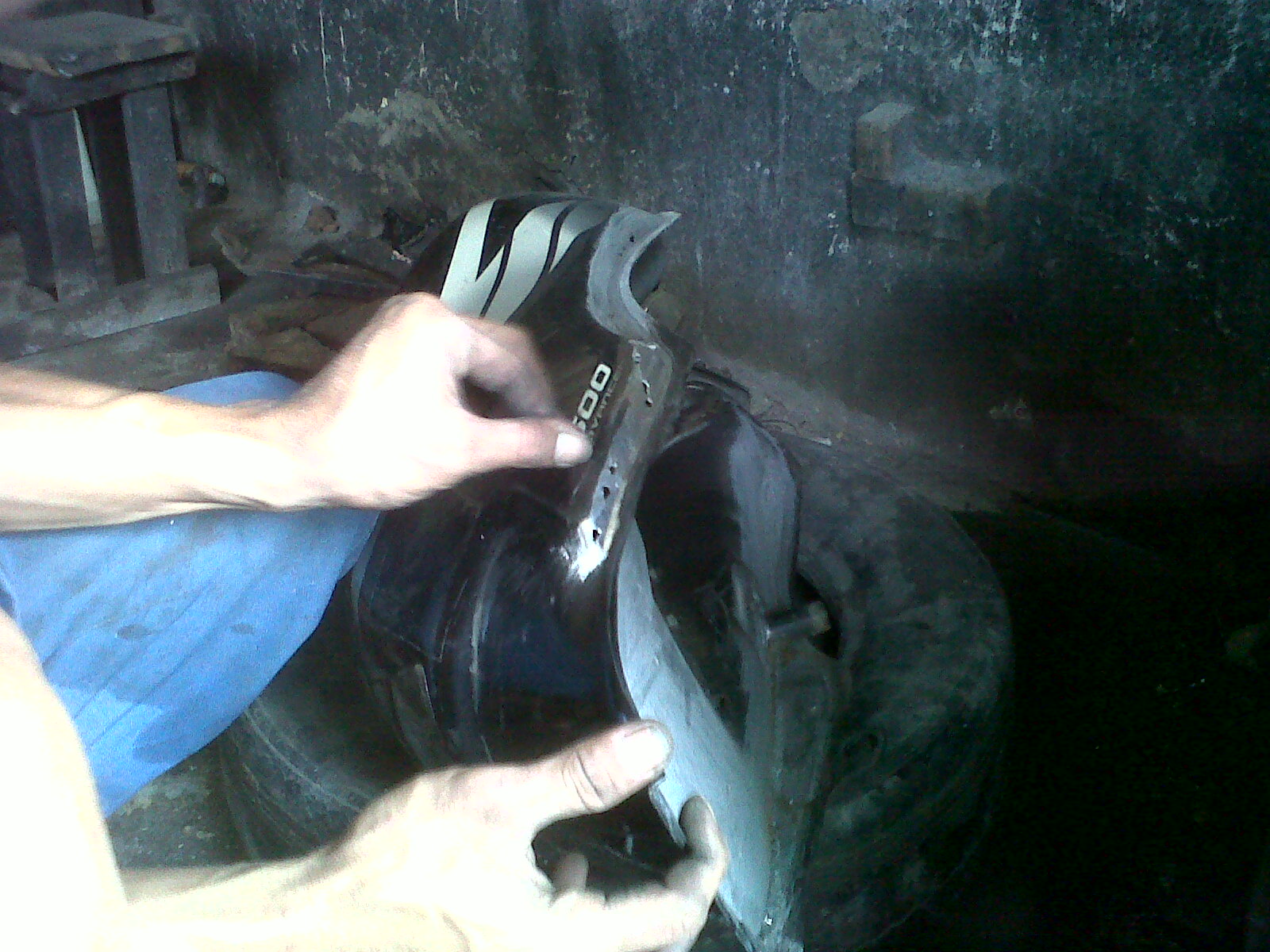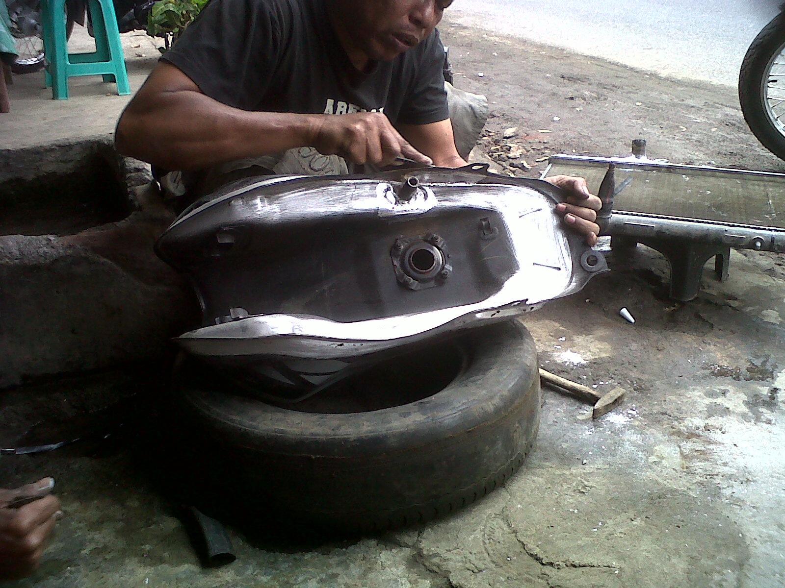 Si jabrik menyarankan dipatri keliling aja, biar gak bolak-balik nambal sedikit2. Meski berat hati, saia akhirnya setuju. Jadilah si tangki dikerok total bagian bawahnya, sisi kiri dan kanan, luar dalam. Toatl waktu sampe hampir Jum’at-an baru selesai, dengan ongkos IDR 115.000. Mahal??? Kalo ngeliat kerjaannya masuk akal sih, telaten banget neglontokin en nyariin bocor-bocor alus..