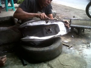 Akhirnya, pas agak siangan saia cek kondisi tangki. Memang terlihat rembesan bensin bercampur debu di bagian bawah tangki. Saia kerok2, eh, malah pada melembung, kemudain gak berapa lama catnya ngelontok…merembeslah si bensin dengan gagahnya…