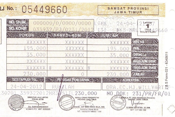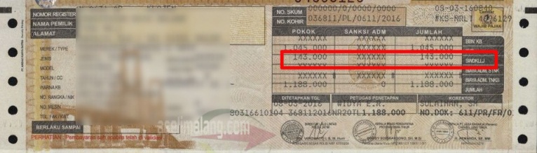 Urutan keterangan di sisi kanan nominal pembayaran ada beberapa macam. Ada BBNKB, yaitu Bea Balik Nama Kendaraan Bermotor, biasanya tertera saat pertama kali bayar pajak untuk kendaraan bermotor baru. Kemudian ada PKB, yaitu Pajak Kendaraan Bermotor yang berisi nominal pajak yang telah dibayarkan. Baris di bawahnya, ada singkatan SWDKLLJ. Nah lho, apaan tuh??