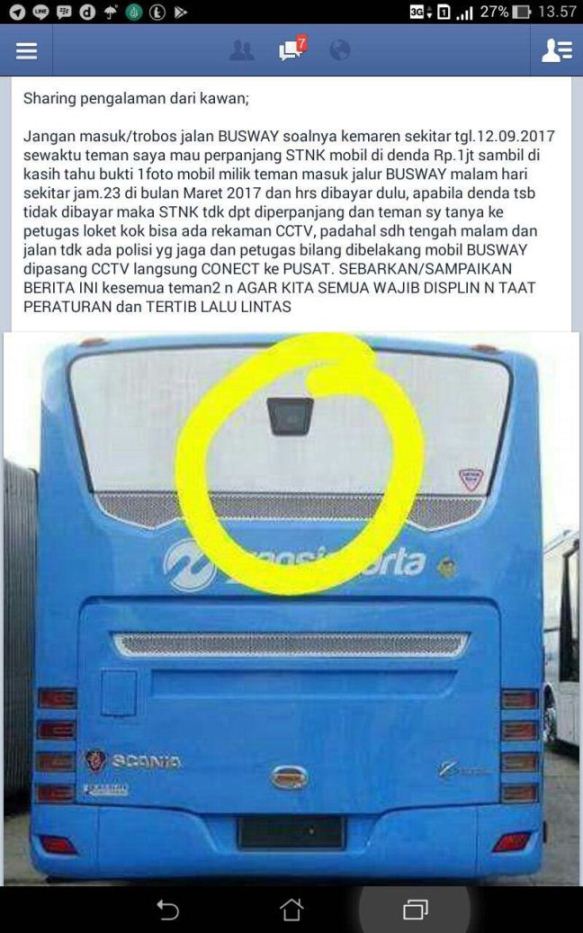 Di sebuah medsos, bahkan si akun menceritakan kalau rekannya, ‘dikenakan’ denda tilang gara-gara ketahuan menerobos jalur busway. Memang sih, menerobos jalur busway itu merupakan sebuah pelanggaran lalu lintas, dan sudah pada tempatnya kalau dikenakan tindakan tilang oleh pihak kepolisian. Nah, dalam skrinsyut berikut, diberikan keterangan kalau bukti pelanggaran menerobos jalur khusus busway tersebut adalah rekaman CCTV.