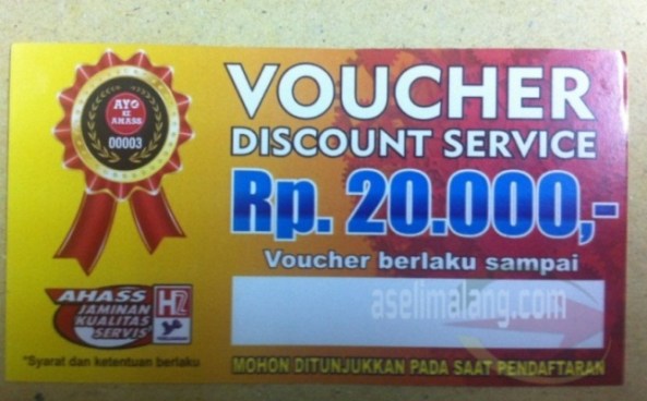 Promo ini, berupa bagi-bagi voucher senilai IDR 20.000 yang digelar MPM Basuki Rahmat Malang, khusus bagi rekan-rekan pengemudi ojek online. Cukup membawa voucher ini saat melakukan service di AHAS 0003 Malang, tentunya juga wajib membawa identitas si motor berupa STNK dan identitas pemiliknya. Asyik kan, langsung dipotong tuh biaya service sebesar IDR 20.000. Misal jasa service kena IDR 60.000, dikurangi voucher, tinggal bayar aja sisanya IDR 40.000. Lumayan….