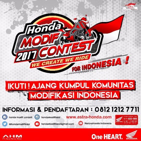 Last, tak perlu ragu memodifikasi motor Honda masbro. entah itu digarap sendiri, atau menggandeng bengkel. Pastikan ide orisinal dan safety selain tentunya tetap berfungsi maksimal sebagai kendaraan. Tetap memodifikasi dengan aman ya masbro dan mbaksis. Meriahkan HMC 2017 dan semoga berguna