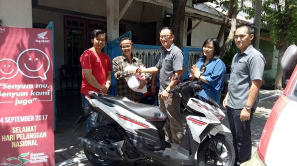Setiap tahun HARPELNAS selalu dirayakan oleh banyak perusahaan melalui berbagai bentuk kegiatan pelayanan yang spesial bagi pelanggan mereka. Tak terkecuali, PT Mitra Pinastika Mulia, distributor motor Honda untuk area Jawa Timur dan Nusa Tenggara Timur. Salah satu wujudnya, Dendy Sean T, Direktur Marketing MPM beserta M Bondan Priyoadi, secara khusus bersilaturahmi langsung dengan konsumen setia Honda di Surabaya. Bapak Sapari, konsumen yang beruntung ini, menerima kehadiran dua perwakilan inti PT MPM untuk menyerahkan langsung unit motor Honda Vario 125 CBS yang dibeli beliau dari MPM Simpang Dukuh Surabaya.