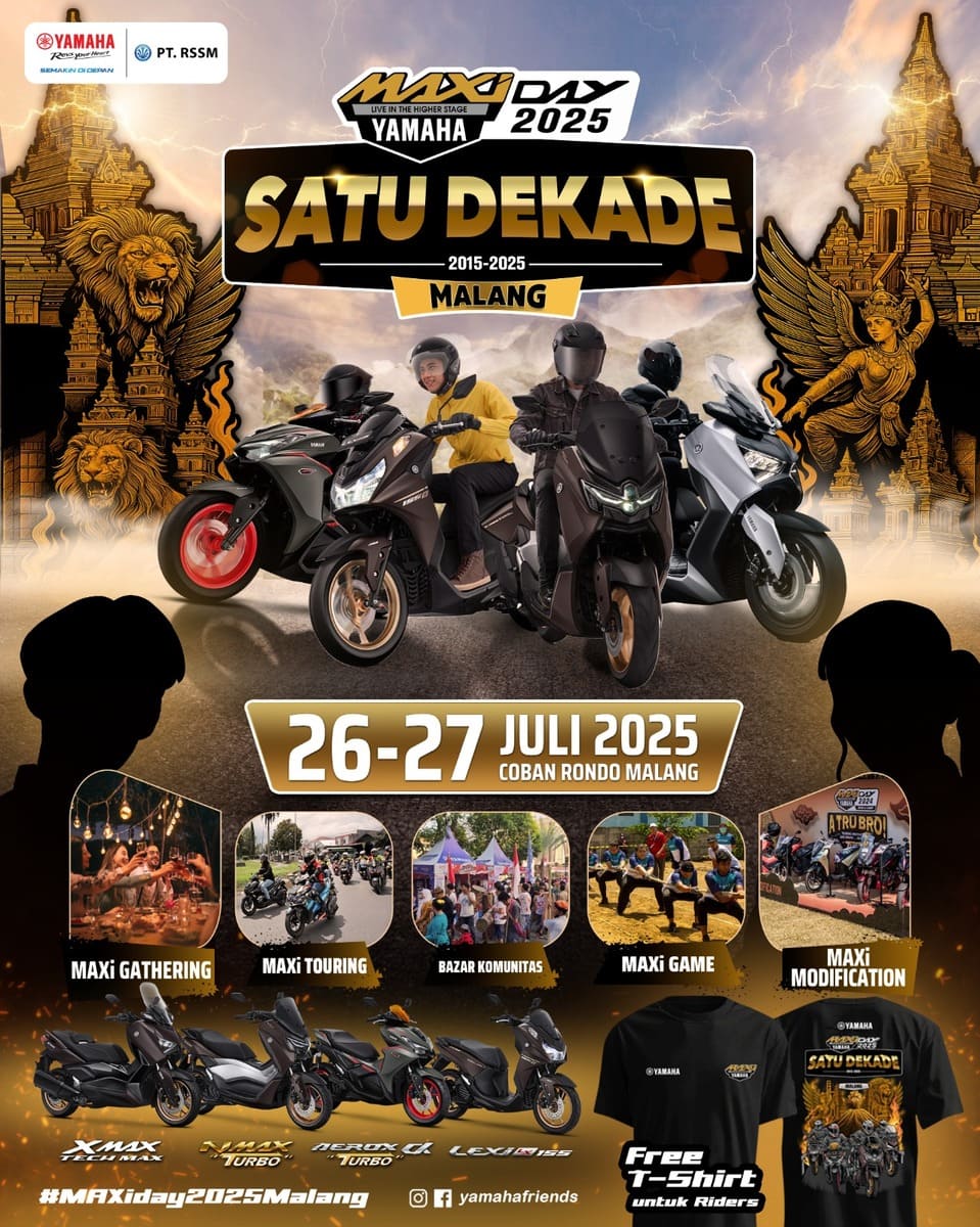PT. Yamaha Indonesia Motor Mfg. (YIMM) bersama PT. Roda Sakti Surya Megah (RSSM) dengan bangga mengumumkan penyelenggaraan kembali acara akbar tahunan bagi para pencinta skutik MAXI, MAXI DAY 2025. Mengusung tema “Satu Dekade”, perhelatan kali ini akan menjadi edisi spesial untuk merayakan 10 tahun perjalanan dan solidaritas komunitas MAXI Yamaha di Indonesia.
