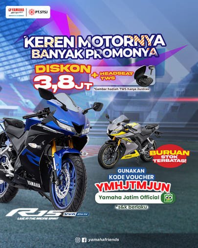 PT. Surya Timur Sakti Jatim (Yamaha STSJ) selaku main dealer motor Yamaha area Jawa Timur, Kalselteng, Kaltim, dan Nusa Tenggara terus memanjakan konsumen Yamaha melalui beragam diskon spesial. Kali ini, diskon spesial diberikan bagi konsumen yang ingin memiliki motor sport Yamaha All New R15 VVA melalui E-Commerce Tokopedia.