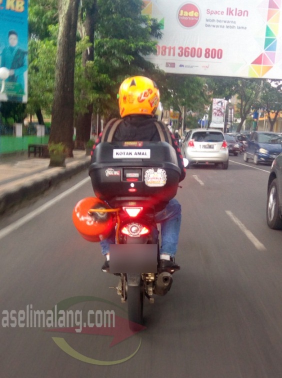 Paling mencolok, memang adalah pemasangan klakson angin, kadang disebut juga telolet. Posisi pemasangan klakson, saat dulu saia jepret di jalan protokol Malang, tidak sempat terlihat. Yang nampak hanyalah tabung penyimpan angin/tekanan berkelir oranye ngejreng di buritan motor.