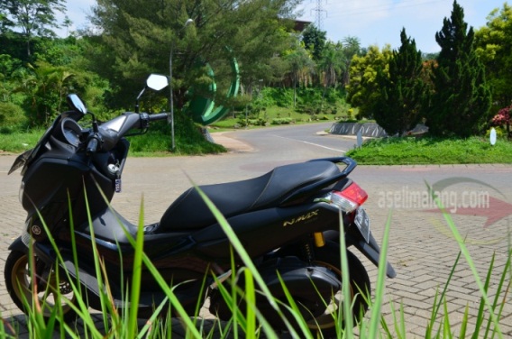 Balutan warna hitam yang nampak kasar bertekstur pada sebagian besar body, dipadu warna hitam metalik mengkilap yang ditambahkan pada bagian tengah. Efek ke fisik NMax, ya makin terlihat gede dan gagah. Kombinasi warna velg gold yang sedikit rada gelap, menimbulkan kesan mewah. Sedikit kurang jreng alias kurang cerah sebenarnya menurut saia, kelir emas-nya. Jadi kurang mencolok, hehehehe.